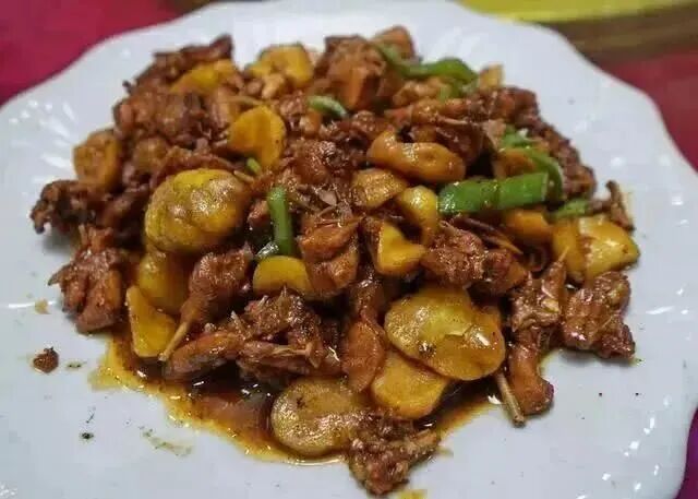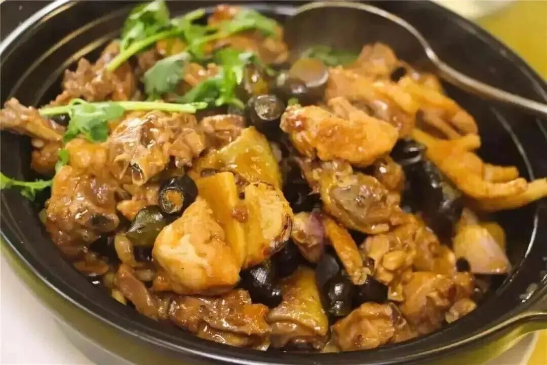 在梁化必点的一道菜——坑螺焗鸡,端上来的时候,坑螺和鸡肉的香味扑面而来。