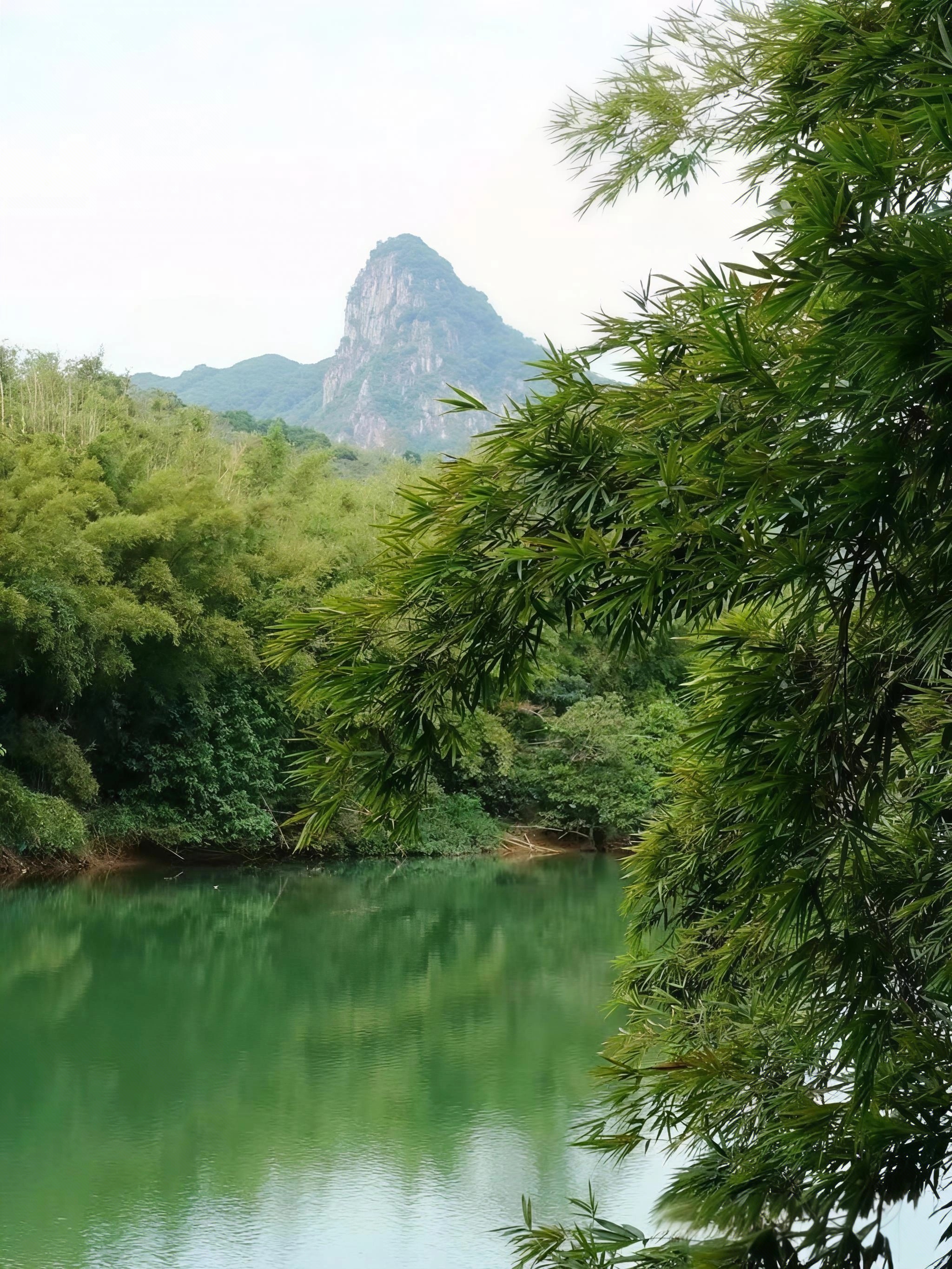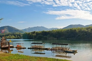 撑竹筏漫漂于河中,远眺群山环抱,良田葱翠,一派田园风光;近观,沿河两岸,竹林、芭蕉林、果林及美丽沙滩,清澈溪流,一如南方美人,温婉而秀丽,无一不令人赏心悦目,有如仙境。
