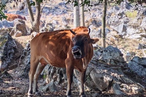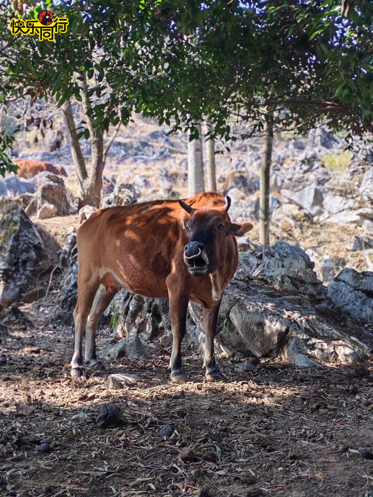 12:30 吃饱喝足,继续出发,深入喀斯特地貌峰林。喀斯特地貌千奇百怪,时常有牛群,羊群与你擦身而过,广阔的石林地带就像一个天然的大牧场,特别的风景点。值得一提的是,这里的石林是目前广东省内发现的最大连片阳石林,丛林间还隐藏着一些古村破旧的残墙断瓦,偶尔还可见到如同世外桃源一样的山中人家,炊烟缈缈;