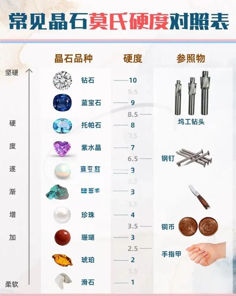 莫氏硬度——衡量矿石硬度的 “通用标准”,就像给矿石的坚固程度贴了 “硬度标签”,从软到硬共分10级:1级的滑石软到能被指甲划伤,10级钻石是最硬的天然矿物,而水晶硬度高达7级。