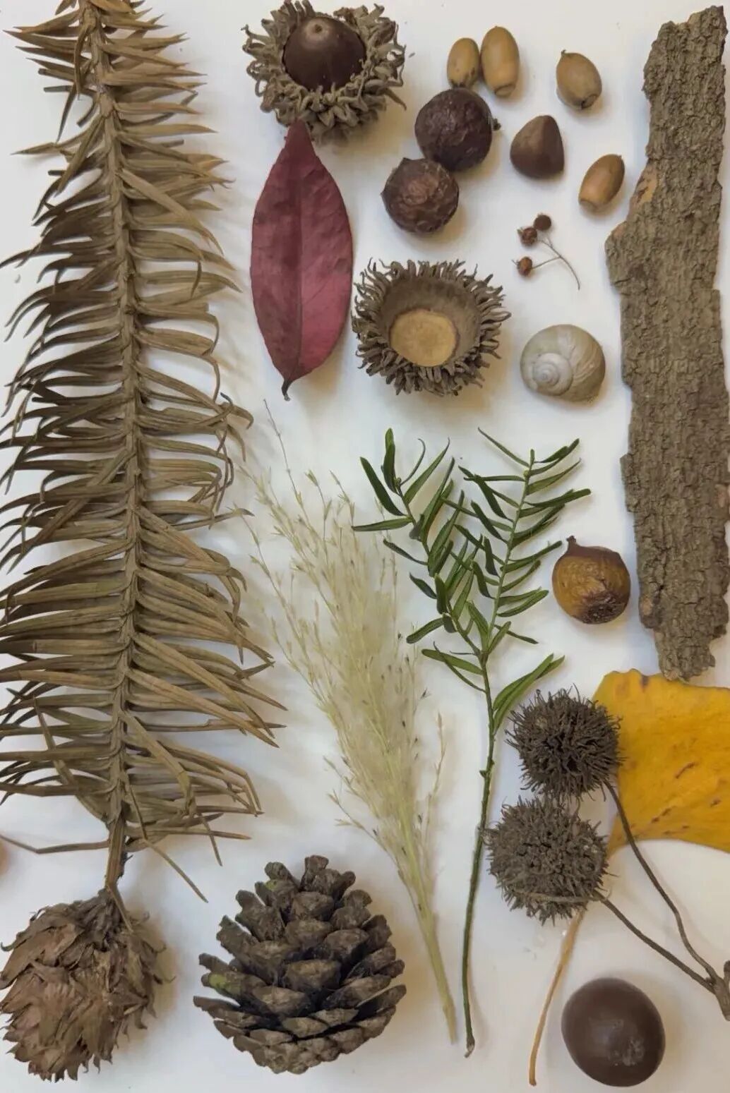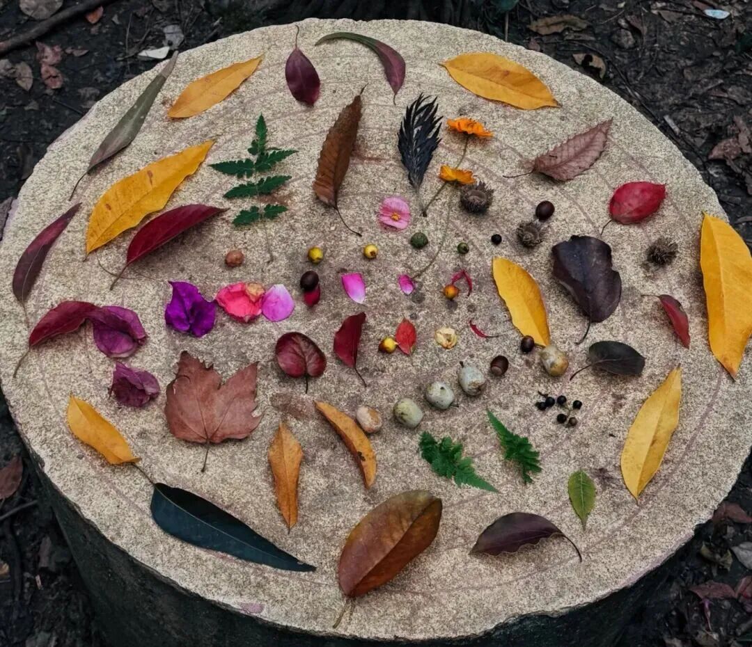 沿途收集路边的落叶、小花、树枝、植物果实,还可以捡一些路边的小石子,作为独一无二的 “艺术素材”。