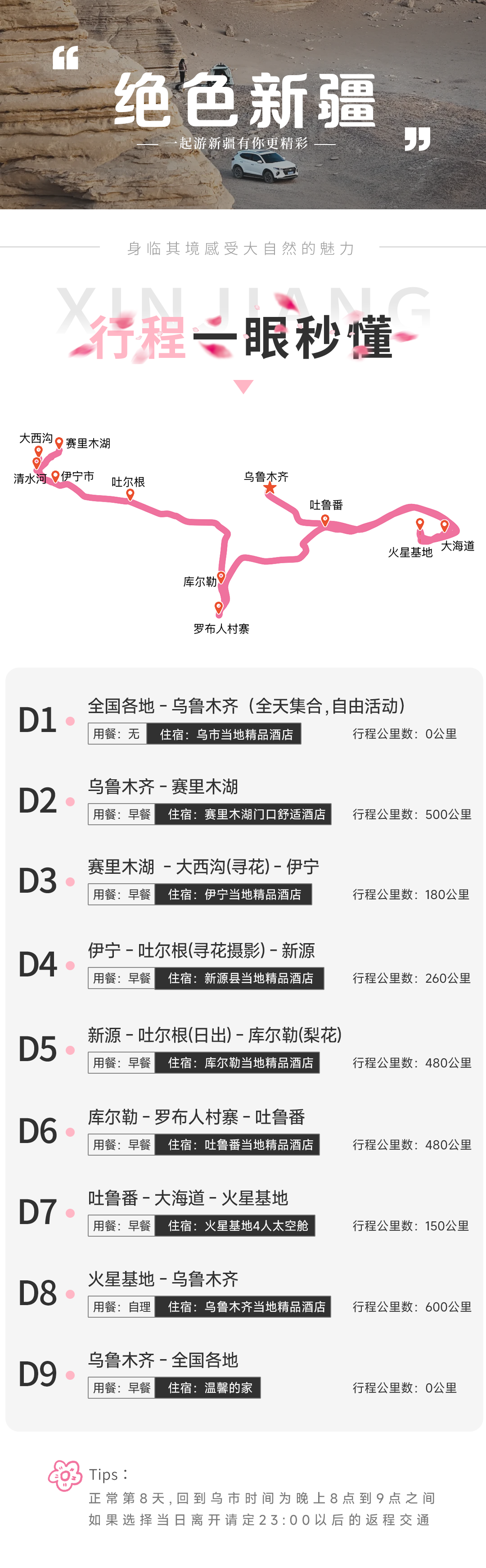 1.新疆地域广袤,昼夜温差大,光照时间长,行车时间长,跨度大,整个行程有跨越四季的之感,新疆境内限速情况常见,请大家做好相应准备。