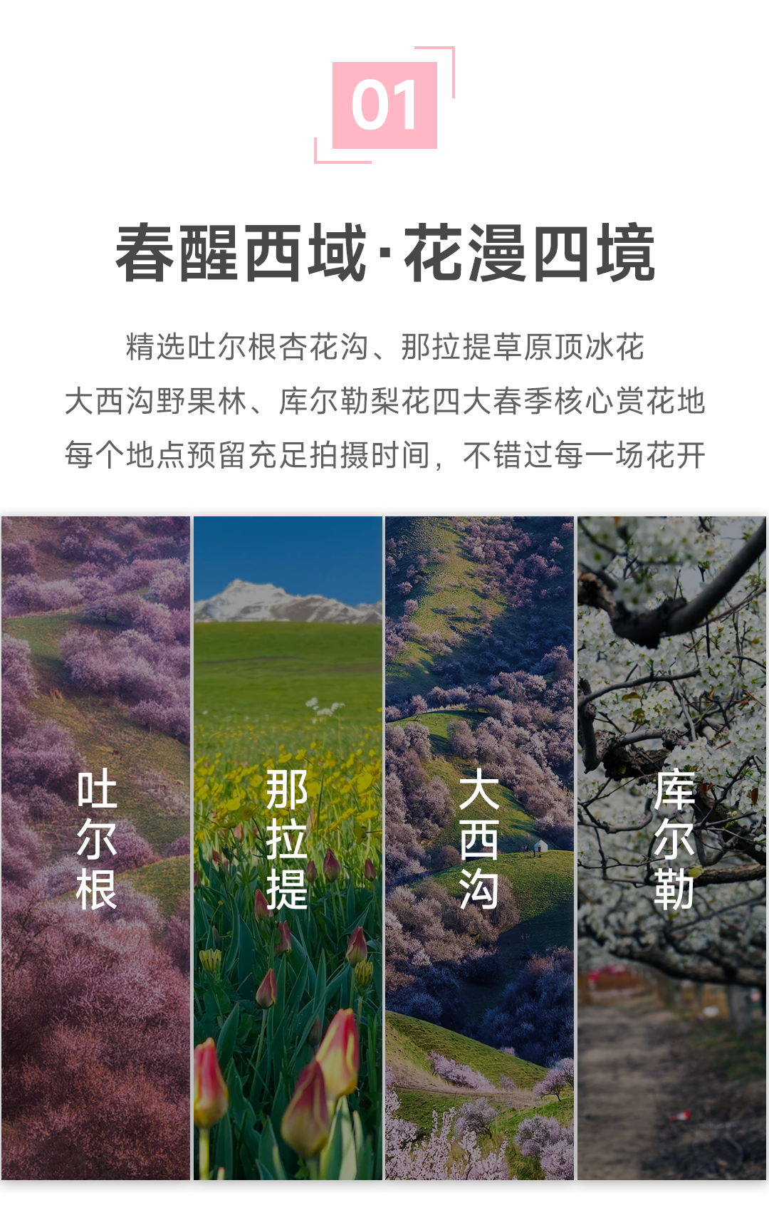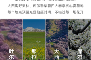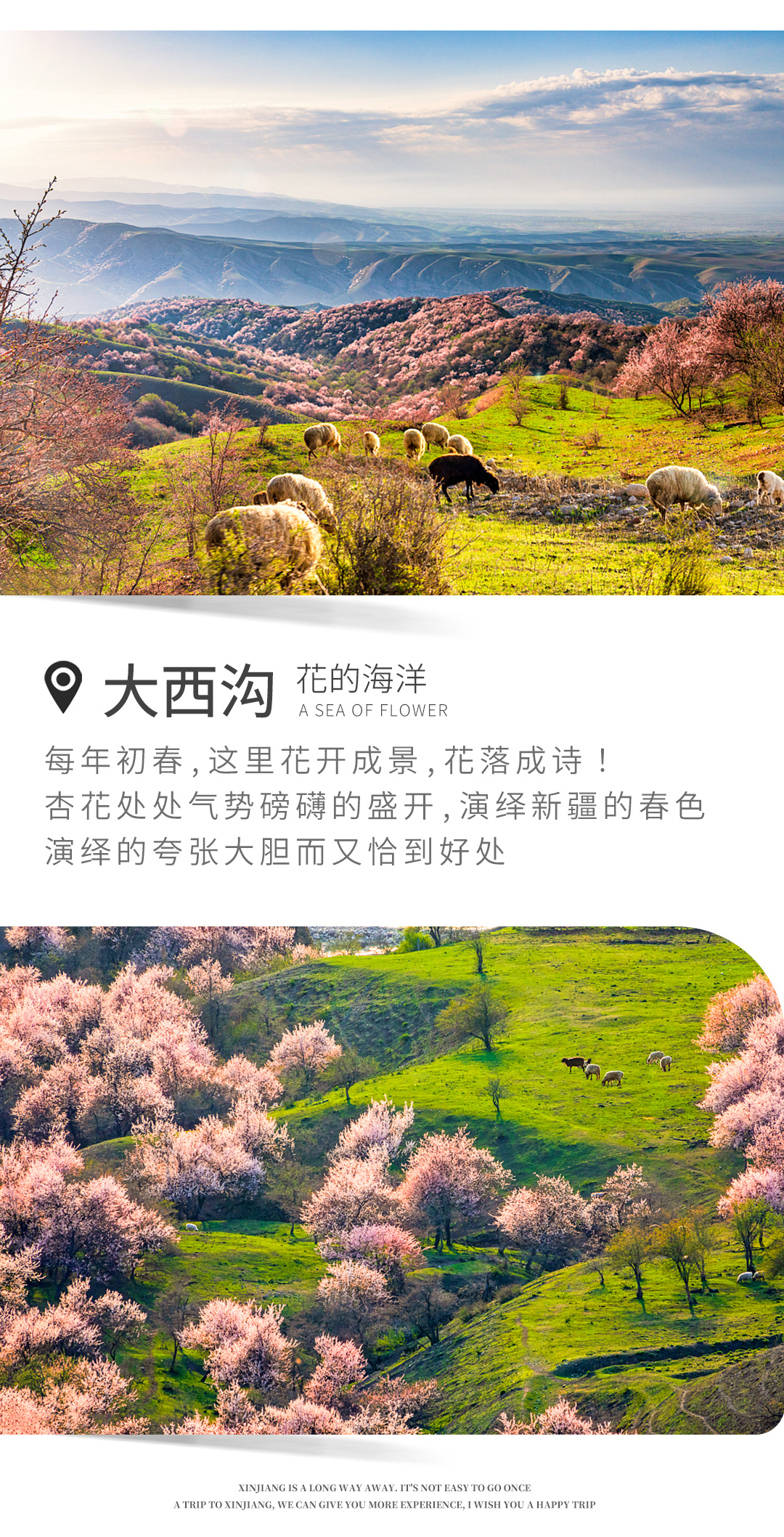 温馨提示:新疆的杏花,通常在4 月中上旬盛开,杏花花期较短,受气温以及天气变化影响较大,每年花期不固定,无法确保最佳花期。不同地方花开时间不同,敬请谅解!也可能因为天气原因会涉及行程的微调,届时请配合导游工作。