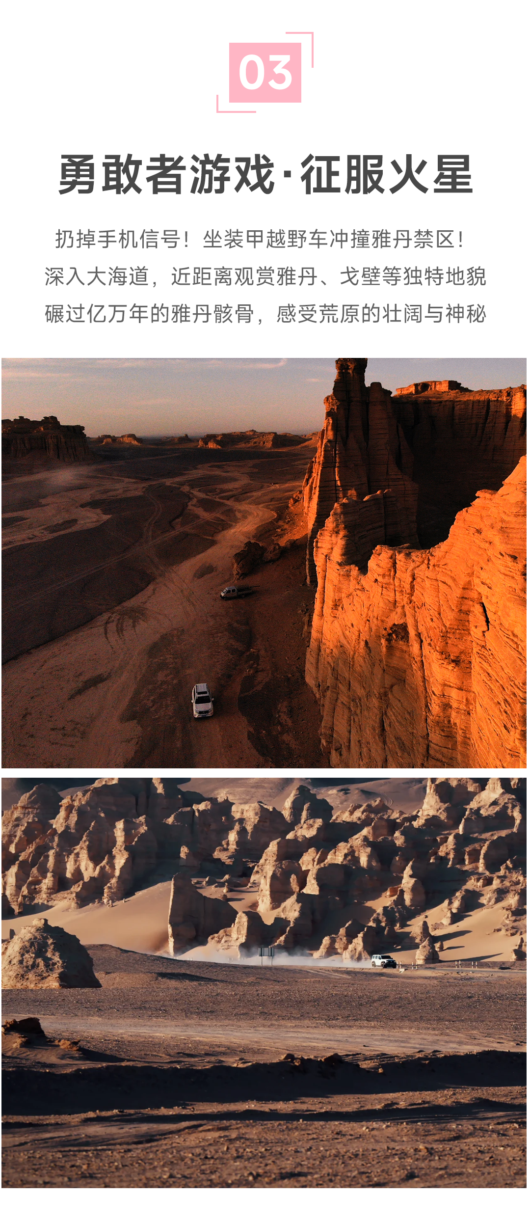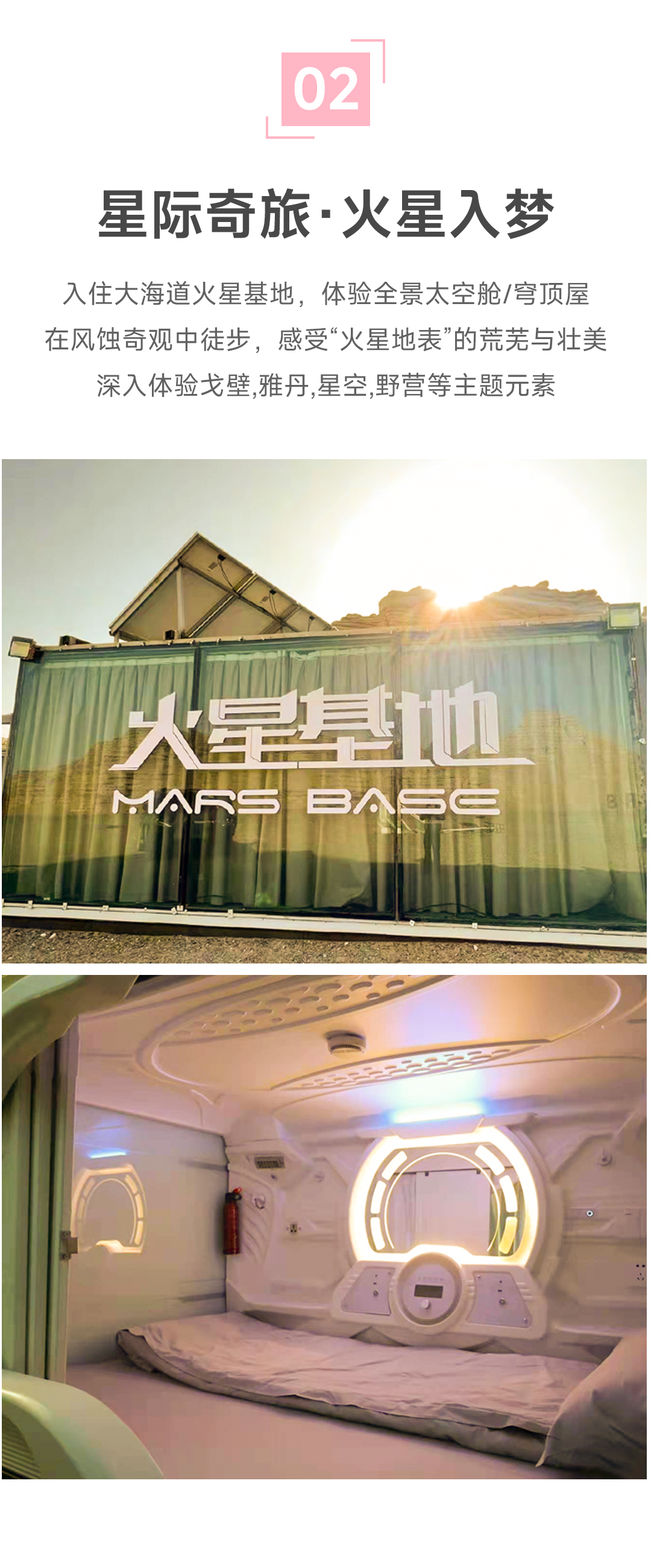 1. 大海道火星基地位于水源地西北方向4公里,被雅丹地貌所环绕,胶囊式太空舱设计,舱内配备空调、落地窗、天窗、整体卫浴。结合给人以震撼的独特的无人区场景,产生极强的穿越代入感—“飞离地球,生活在火星表面”!
