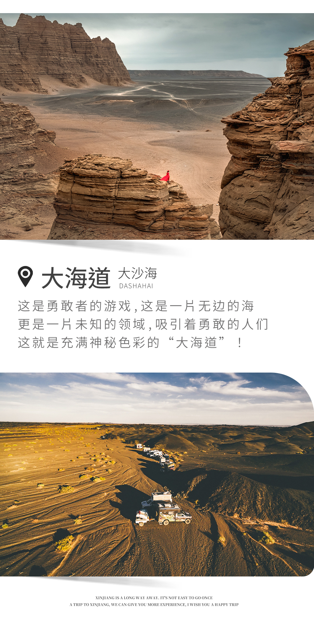 早餐后,开始驱车前往大海道,大海道是古代敦煌吐鲁番之间最近的一条道路。它的开通和使用始于汉代,唐代以后官方的利用趋于停止,大海道也逐渐淡出人们的视野,成为停留于历史记忆的丝绸之路古道。唐代被称为“大沙海”,“大海道”也因此得名。一路上雅丹奇观一次次震撼你的双眼。这里降水量极少,地表水和地下水非常缺乏,且含盐量高,气候极为干旱,到处呈现荒漠景象,是世界上大陆性气候最强烈的地区之一。在这里拍照,人人都是摄影大师!