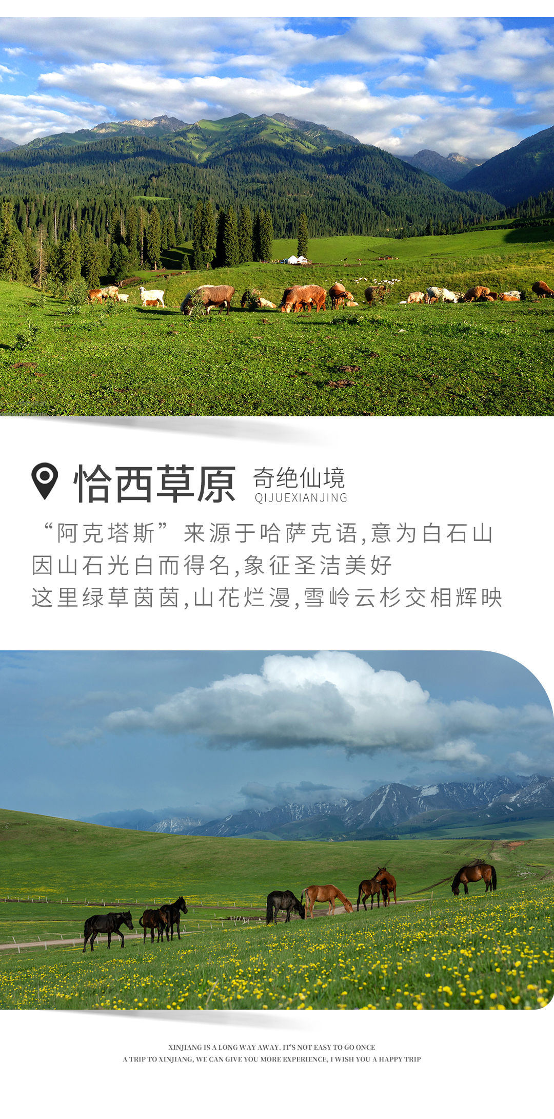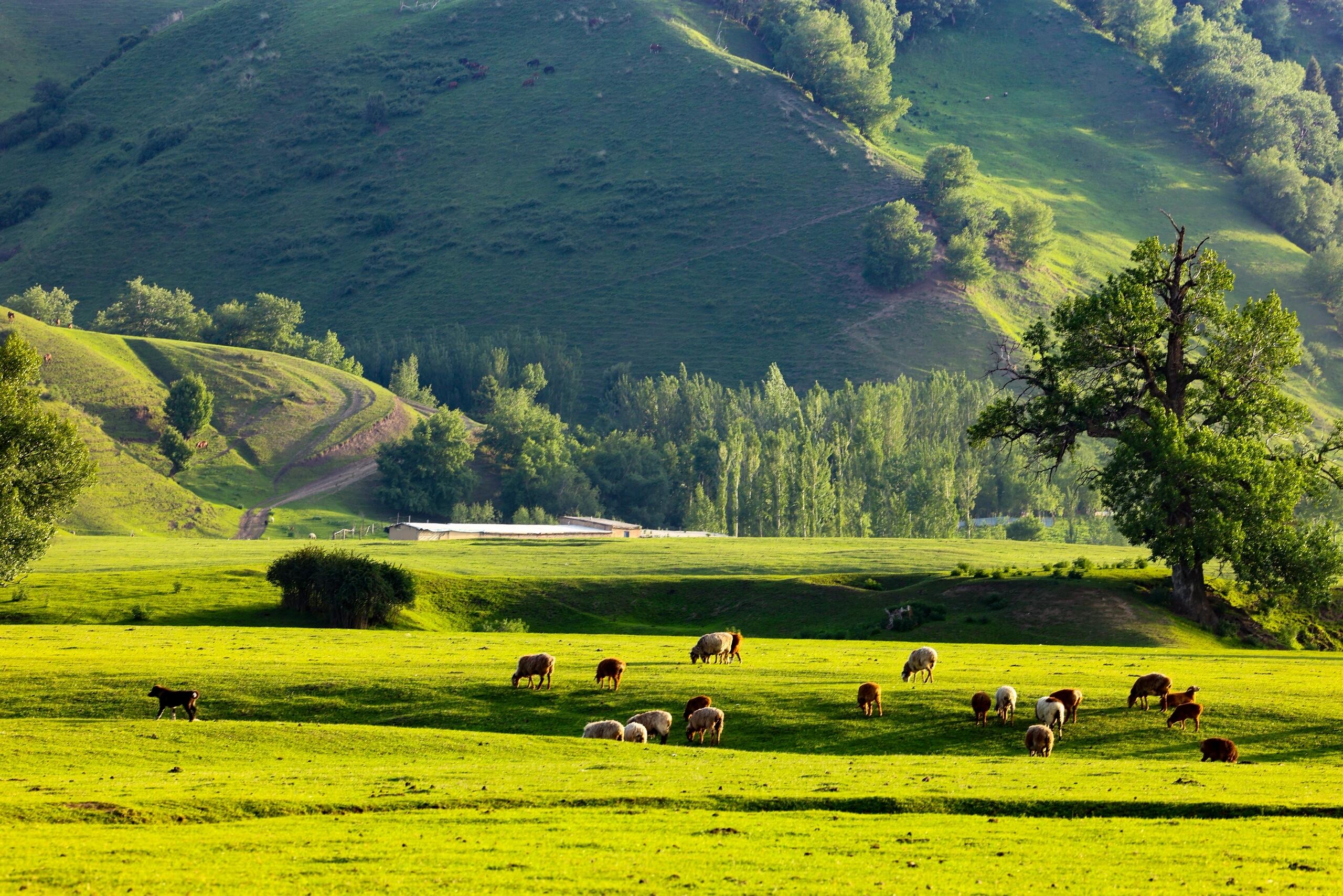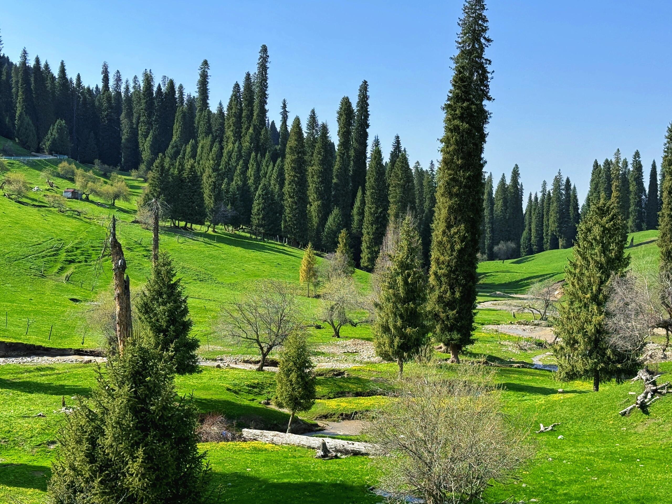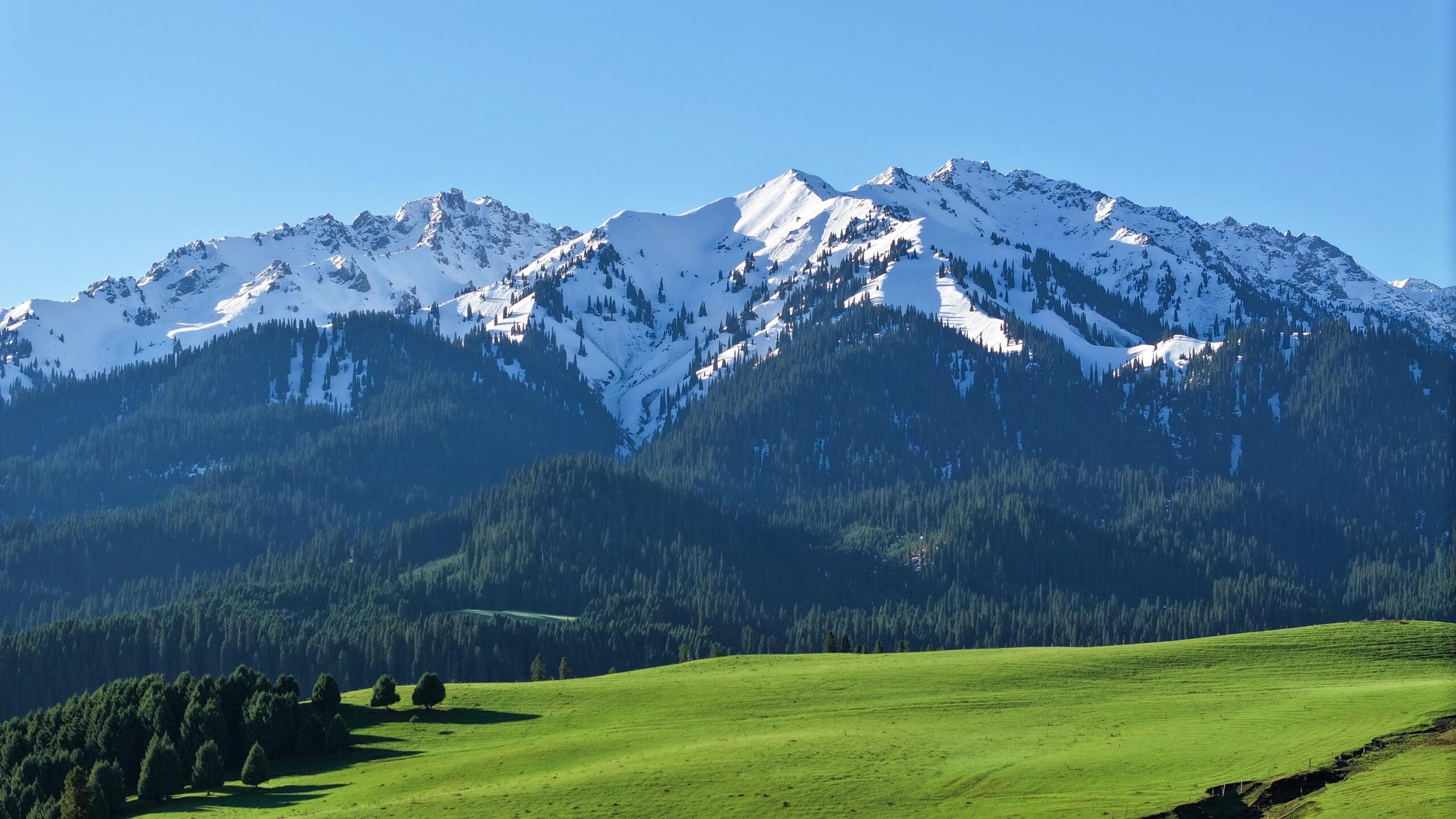 早上吃过早餐后驱车前往恰西,塞外江南在伊犁,伊犁最秀是恰西。恰西国家森林公园是著名林区,有着连绵不绝的雪岭云杉,国家农业展览馆陈列的“云杉王”截样就出自这里。一群群牛羊在蓝天、绿草间游动,恬静而悠然;星星点点的毡房,在湛蓝的天空下,于盈盈绿草间闪着耀眼的白光草原深处,苍鹰自由翱翔,草丛中,土拨鼠正悄悄张望。蓝天、白云、绿草、羊群、马群组成一幅大自然的神奇画卷。徜徉恰西草原,幽深的峡谷、蜿蜒的河水,皑皑的雪山、绿绿的草毯,挺拔的云杉、游荡的牛马......像是天地间的美好组合叠加在一起,屏蔽了尘世间的一切喧嚣。