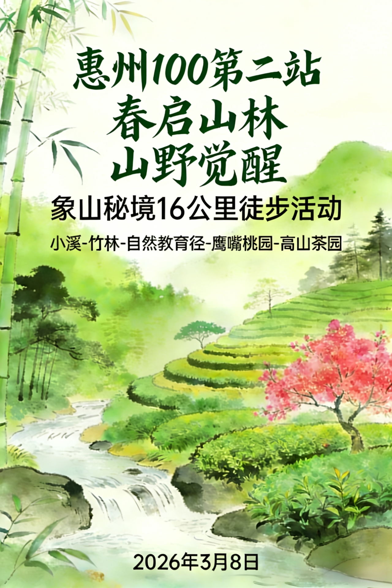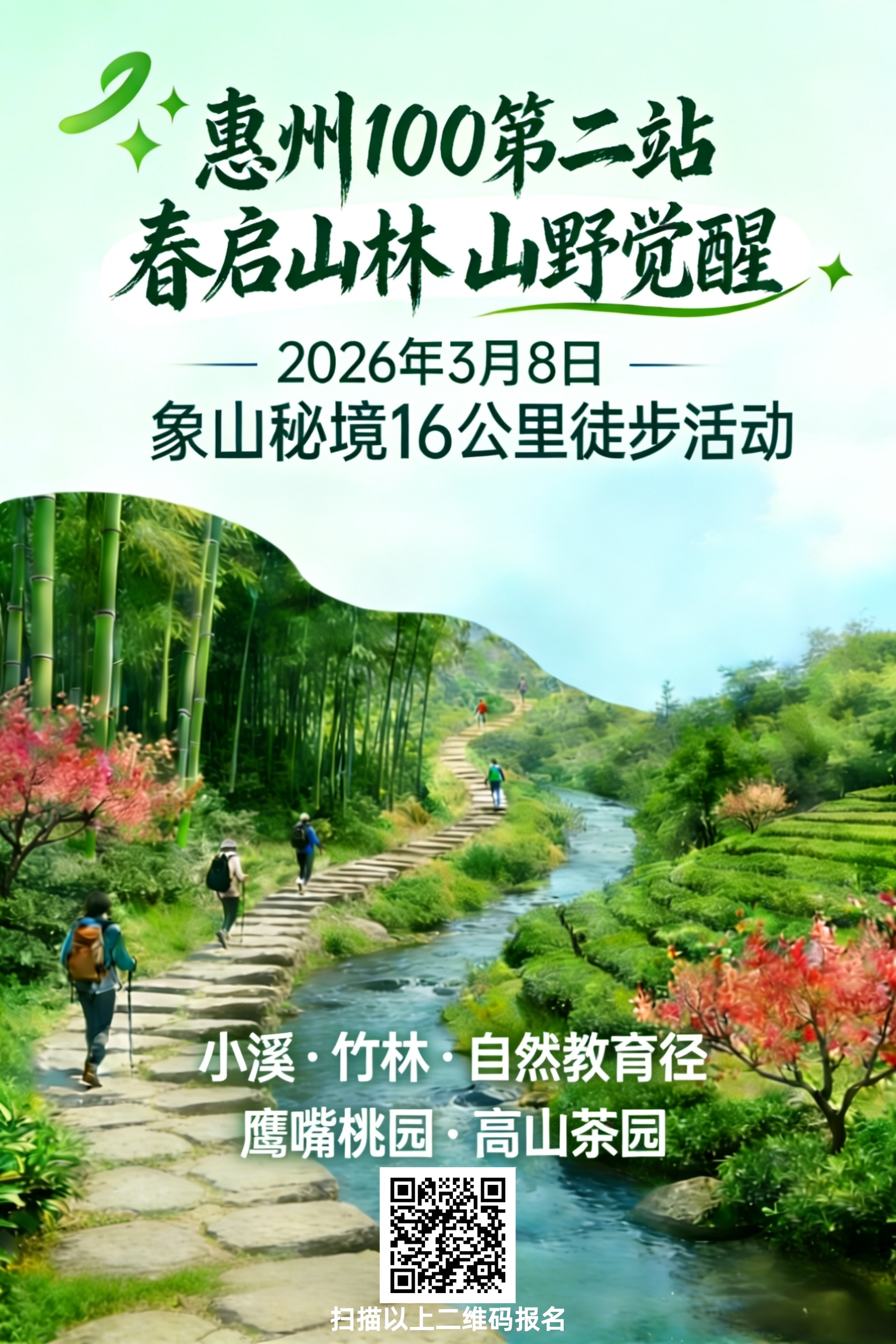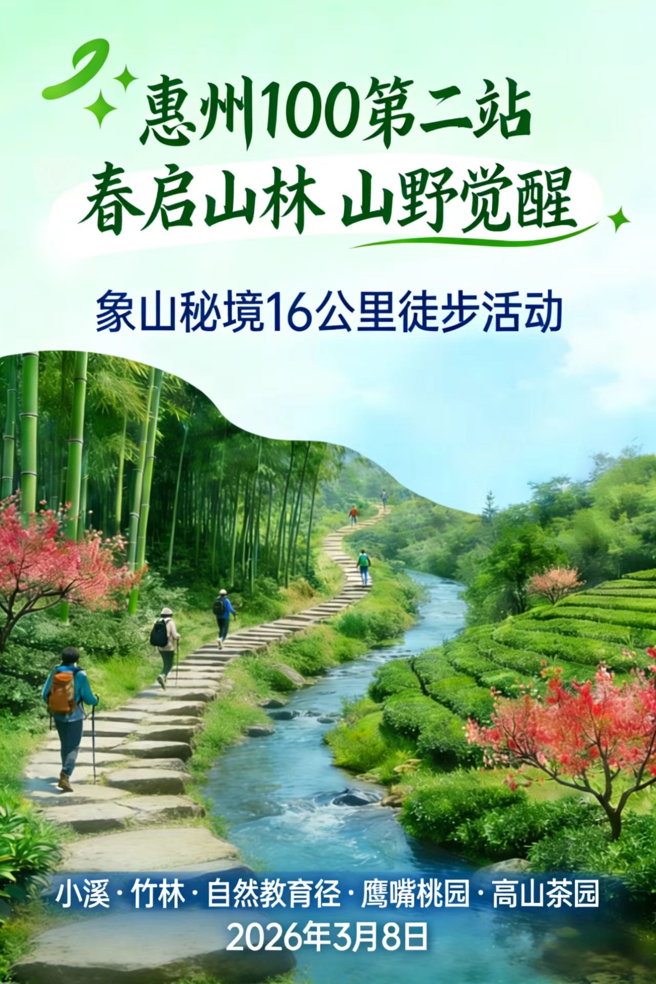 10:30-16:30 春启山林 山野觉醒 2026万象徒步 · 惠州100公里山海征程系列 第二站 活动开启,一起用脚步丈量象山秘境、小溪竹林、鹰嘴桃园、高山茶园,发现绿美泰美;