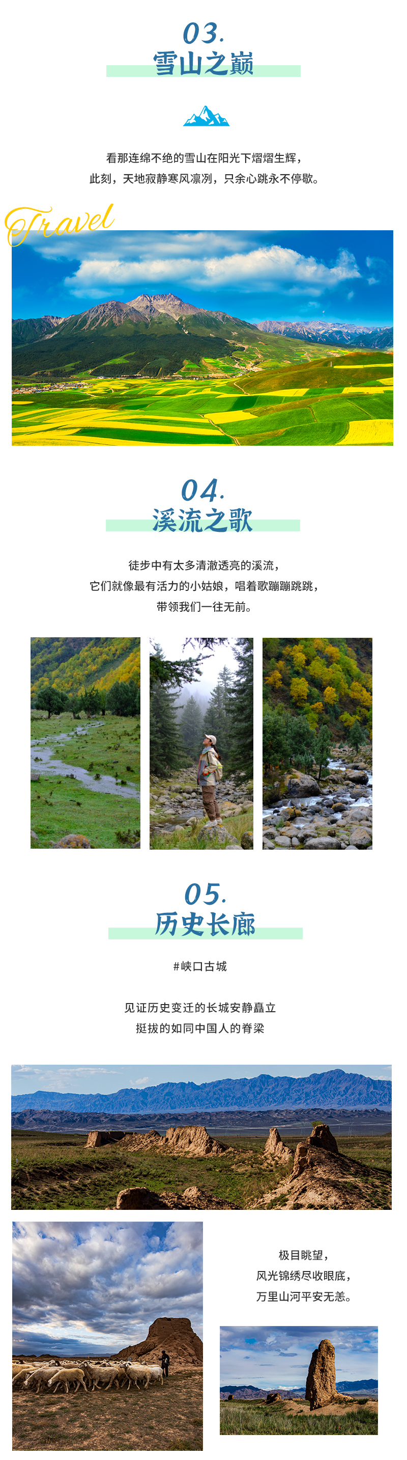 从张骞出使西域,到玄奘西天取经,这里曾来过壮志未酬的林则徐,也曾站过意气风发的霍去病。乌鞘岭的云烟和雪山交缠,在风的催使下蜿蜒西去,目之所及皆是雄美壮阔。顺着木栈道走上观景台,抬头是“祁连千峰起,雪山万重连”的巍峨,是三大高原交汇处的震撼。吹一吹先辈们曾吹过的风吧,把他们的信念和勇气延续下去。