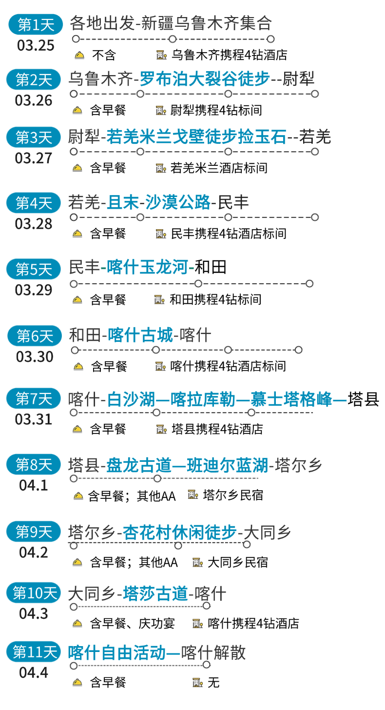 2.住宿:共10晚住宿,乌鲁木齐酒店、尉犁县酒店、若羌米兰酒店、民丰酒店、和田酒店、喀什酒店2晚、塔县酒店、塔尔乡杏花村民宿、大同乡民宿。