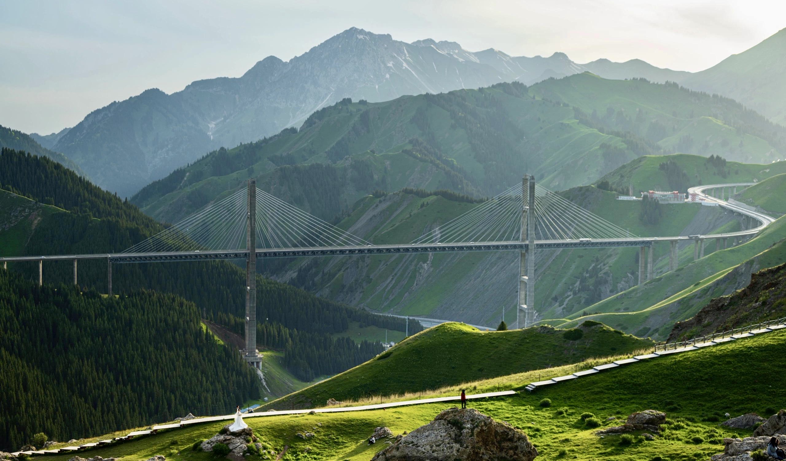 下午环湖驶出,前往果子沟观景平台,仰望果子沟大桥横跨天际,听老师讲述钢桁梁里的智慧,感受中国基建的壮举。