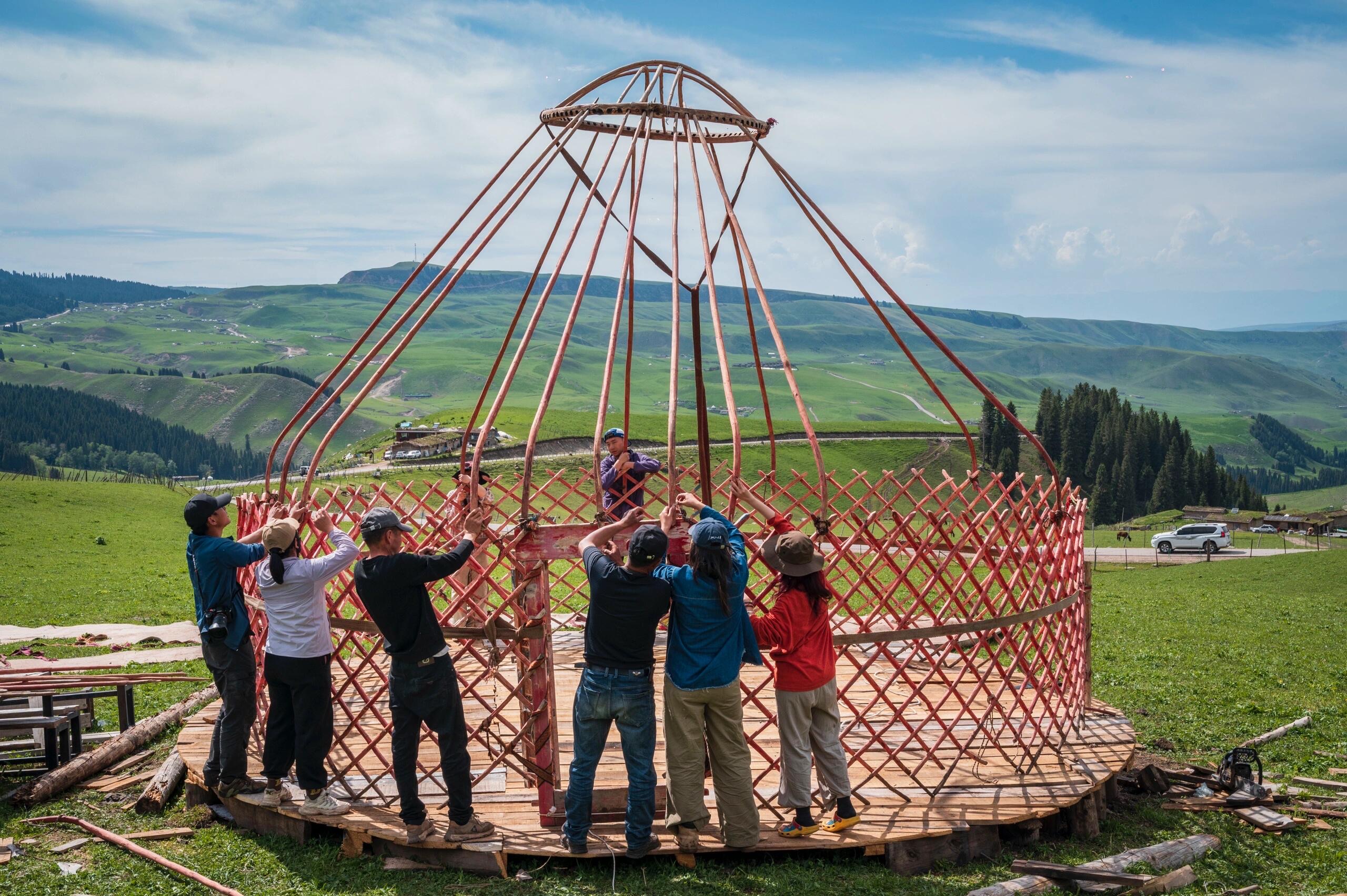 下午开始毡房搭建,使用传统羊毛毡,木杆,毛绳等天然材料,在经验丰富的哈萨克老师傅指导下,手把手教你搭建技巧,与伙伴们齐心协力,共同完成搭建任务,留下独一无二的旅行纪念和难忘的草原时光。