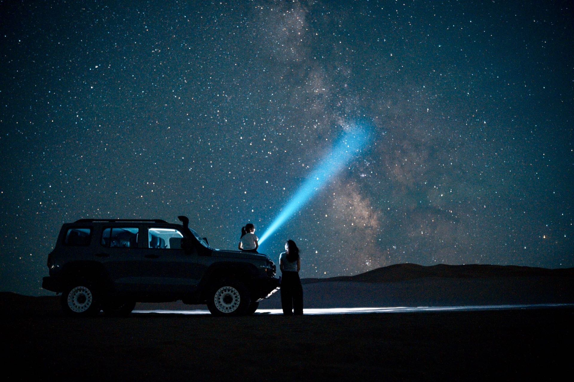 傍晚,在沙漠星空下我们一起围绕篝火,品味新疆特色美食烤全羊,载歌载舞。