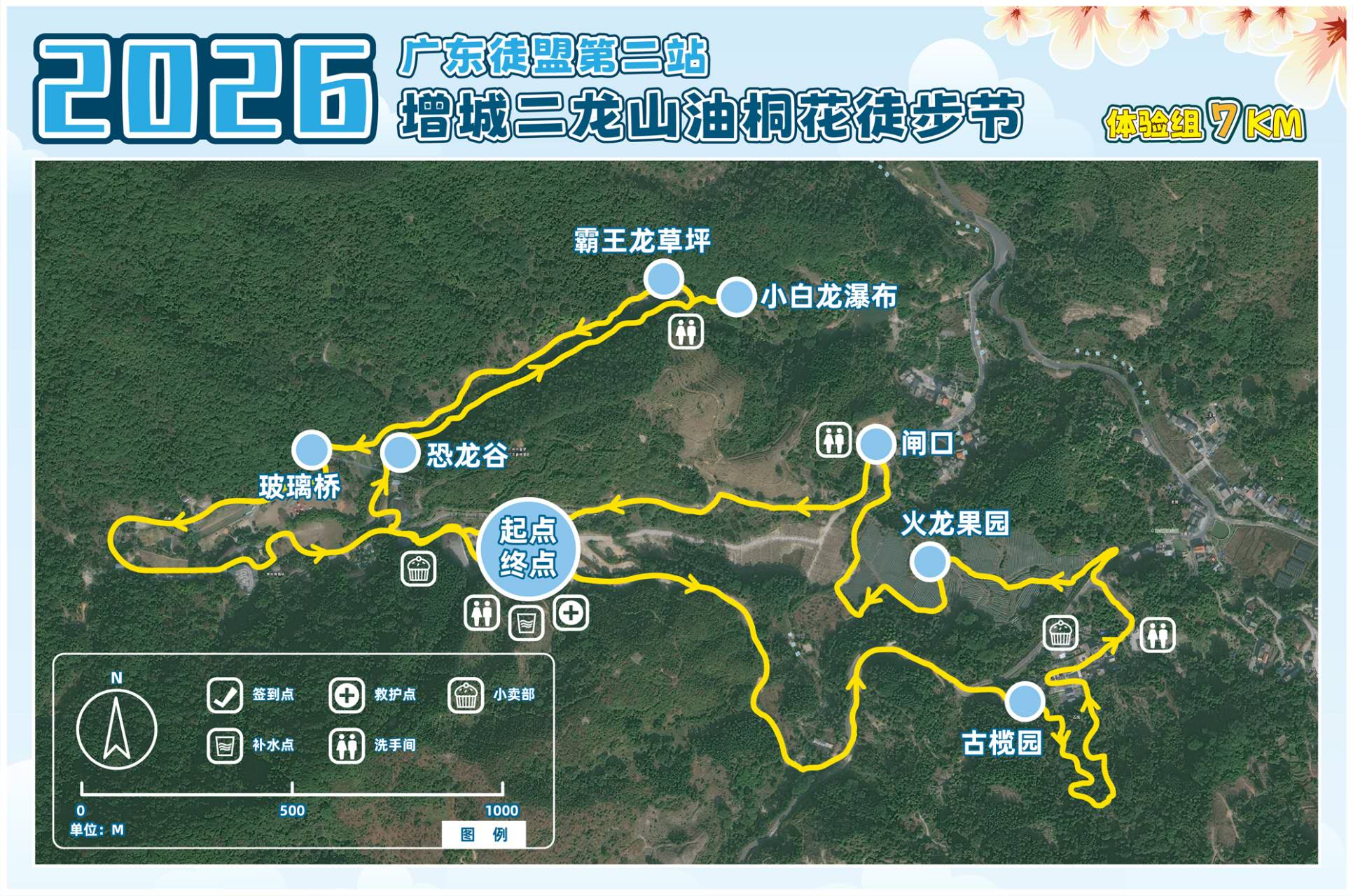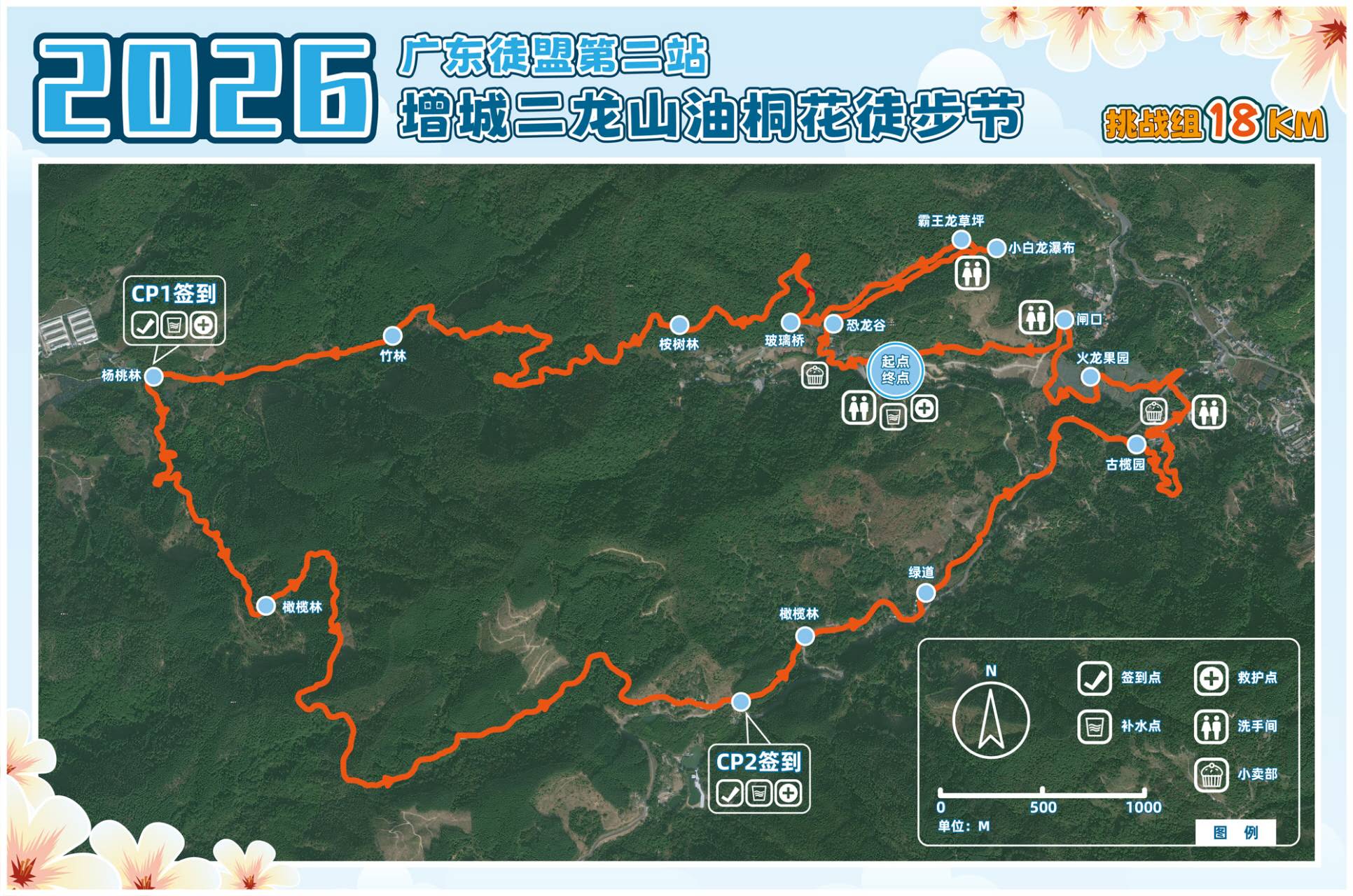 起点——景区内环线——观山小镇古榄园——邓山观星小镇——终点签到(徒步+休闲游玩约5小时),亲子组不设补给点。