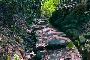起点处便是宽阔的山林土路,两侧是一丛丛的竹子,让人瞬间体会到竹林幽谷的意境。沿着竹林走百来米,就进入石砌的台阶路。这一段据说是百年古驿道,以前畲族人在山上生活时,就是从这里上下山的。