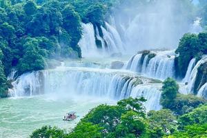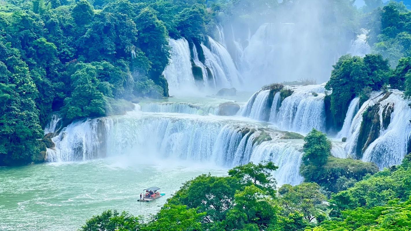 它横跨中越两国,与[越南板约瀑布]相连,宽200多米,落差70多米,纵深60多米, 年平均水流量是黄果树瀑布的三倍,瀑布气势磅礴,三级跌落,声势浩大,无论远观近看,其魄力、其气势、其风采,都让人震魂摄魄